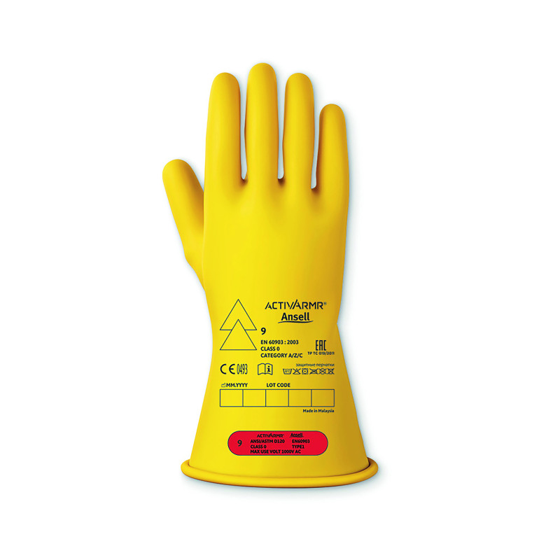 *Ergonomically designed natural rubber electrical insulating gloves for all-day safety and comfort* Natural rubber latex utilises a proprietary environmentally friendly dipping process for ultimate flexibility and dexterity*Ergonomic hand-at-rest shape and non-splayed fingers reduce hand fatigue*Generous flared cuff allows room for clothing*Smooth-finish for easy donning and doffing* 280MM / 11” Length *Used in combination with AN96-002 leather protector to provide mechanical protection (worn over class 00 & 0 only)*Certified for resistance to acid (Category A), Ozone (Category Z) and very low temperatures (Category C)*Applications with risk of touch voltage AC maximum 1000 V (DC maximum 1500)*Electrical Glove Class 0 offers arc flash protection Class 1 in accordance with EN 61482-1-2*EN 60903:2003 Live working. Gloves of insulating material