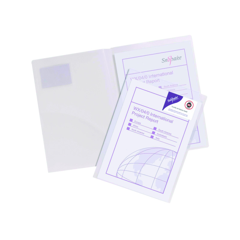 The Snopake TwinFile is an elegant file for presentations, projects, contracts, proposals and more. The 2 internal storage pockets can hold up to 50 sheets of unpunched 80gsm paper and there is space on the front for a business card or label of your choice. This pack contains five A4 files.